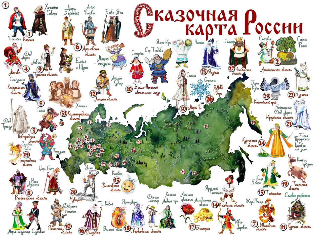 Культурно-туристический межрегиональный проект «Сказочная карта России» представил героев русского эпоса на карте нашей страны. Проект основан на историческом наследии России – сказках, былинах и легендах. Его главная задача – показать места возможного рождения или существования персонажей национального фольклора.
