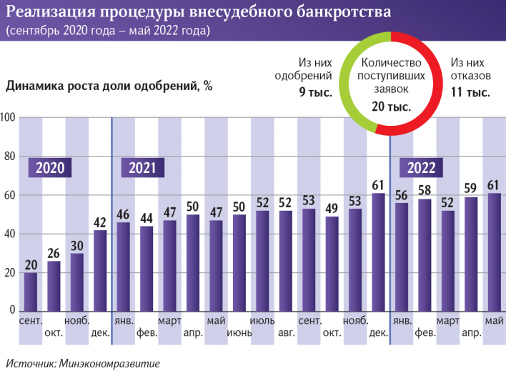 – Доля отказов в возбуждении процедуры внесудебного банкротства снижается. Если в первые месяцы работы этой схемы заявки граждан одобрялись лишь в 30% случаев, то по итогам мая 2022-го эта цифра равна 61%, – отметил Илья Торосов.