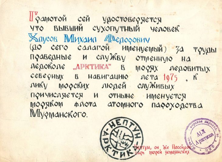 Сегодня с ностальгией вспоминает Михаил Фёдорович прощальный гудок «Сибири», уходящей в долгое плавание, – атомохода, покорившего льды, непосильные для других ледоколов мира, ищет в интернете и находит своих друзей-сослуживцев, с кем «ходил походами». Как зеницу ока бережёт ценные конверты с эксклюзивной бортовой печатью ледокола «Арктика», такую же уникальную книгу с многочисленными фотоиллюстрациями под названием «Арктический рейс «Сибирь» с памятной надписью от капитана, журналы, газеты Министерства морского флота СССР, фотоснимки тех лет. Озвучивает и рекомендует посмотреть мне свои любимые документальные фильмы «Я – атомоход «Сибирь» и «Корабли застывших морей».