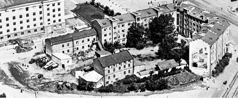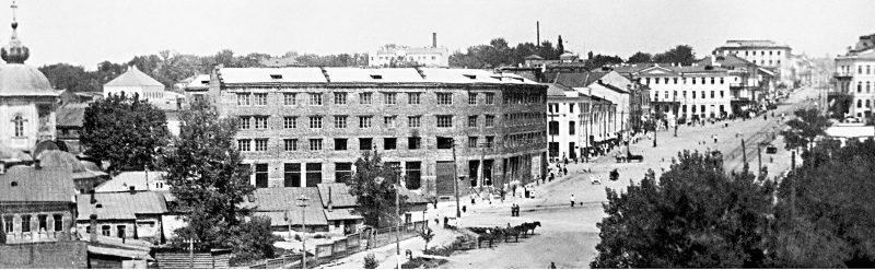 Большая часть площадки, на коей в дальнейшем разместится «здание номер шесть», была свободной уже к 1919 году. Ранее на нём стоял дом купчихи Н.А. Лавровой с магазином бакалейных и колониальных товаров. На втором этаже была гостиница «Петербургская», которую скоро переименовали в «Петроградскую». Сразу после революции там расположилась ГубЧК, само строение при отступлении красных в сентябре 1919-го сожгли. Полусгоревшее, оно долго стояло бесхозным, служа приютом беспризорникам и криминальным элементам.