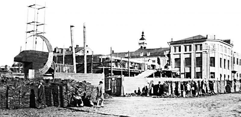 Курск, 1933 год. Возводят 2-й этаж «шестёрки». На заднем плане видна колокольня Фроловской церкви