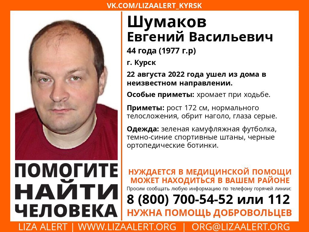 22 августа Евгений Шумаков ушел из дома в Курске и не вернулся.