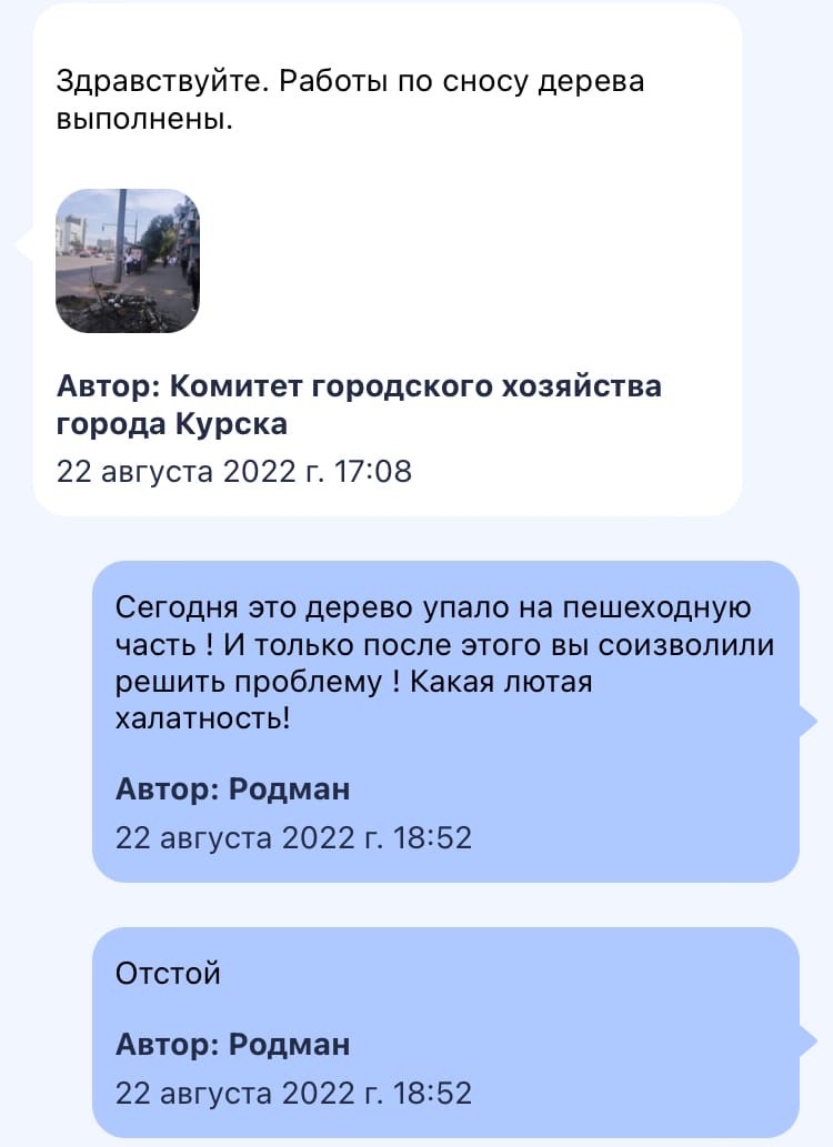 Примечательно, что один из комментаторов поста рассказал, как ещё в начале августа подавал заявку на снос этого дерева на портале «Действуем вместе». Но коммунальщики ответили только в день, когда рухнуло дерево — отчитались о выполненных работах по сносу. В доказательство курянин приложил скриншот переписки. Его обращение датировано 7 августа, время — 14:21. Дерево упало на женщину 22 числа в 12:00. Сообщение от комитета городского хозяйства о выполненных работах по сносу пришло 22 августа в 17:08. По словам очевидцев, рабочие действительно быстро распилили и убрали сухие ветви с тротуара, но распиливали они уже упавшее дерево.