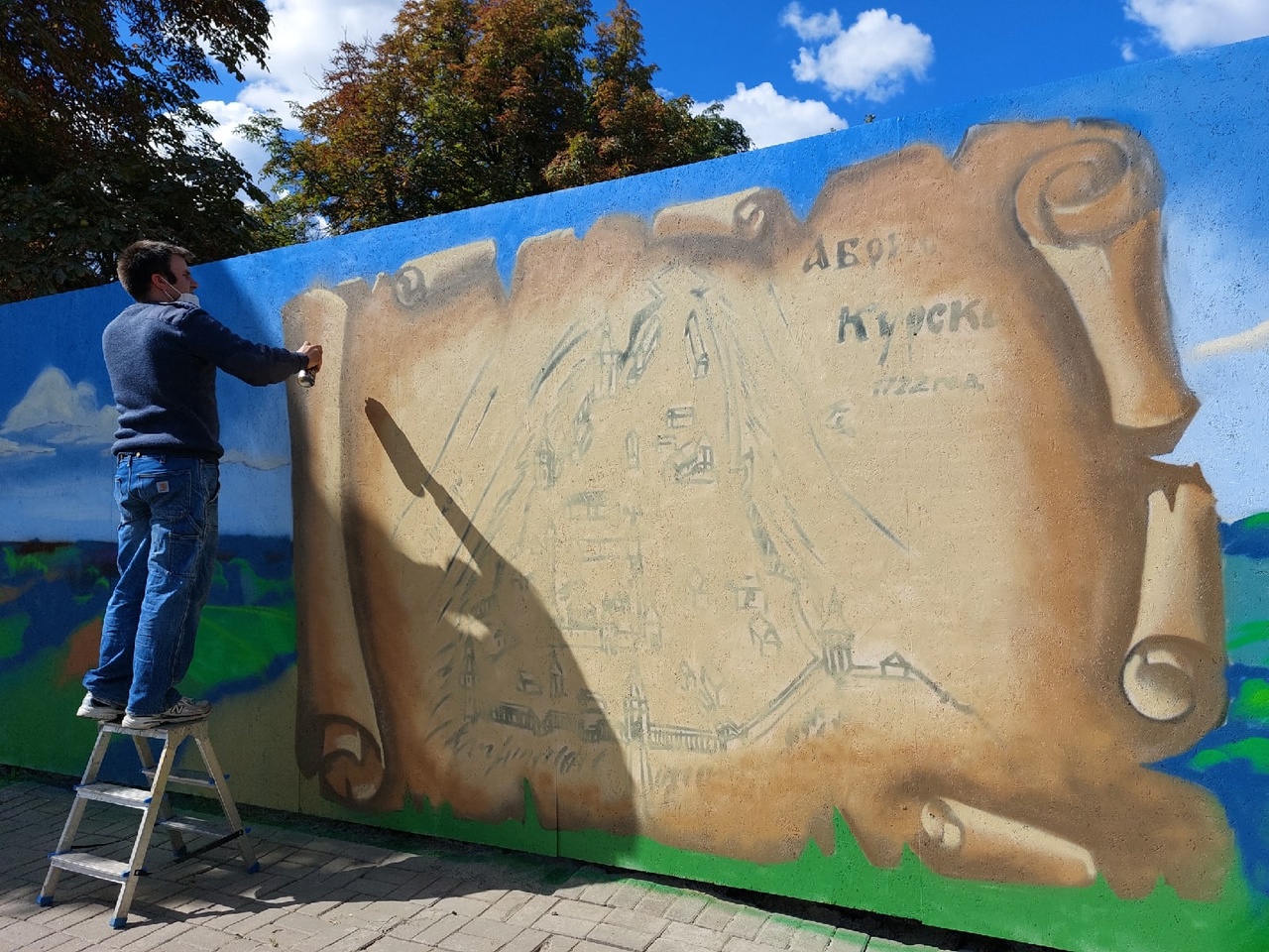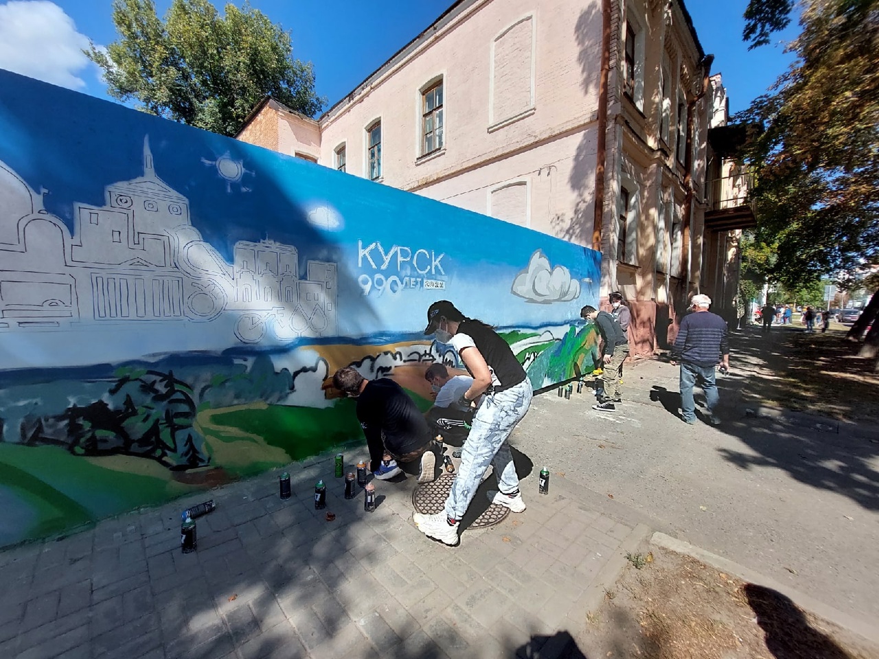 В день 990-летия Курска улица Максима Горького стала пешеходной. Сегодня здесь прошел фестиваль граффити. Порядка 15 художников из Курска и Белгорода собрались, чтобы нарисовать на 40-метровом полотне древнюю курскую крепость. Для стрит-арта здесь специально установили полотно.