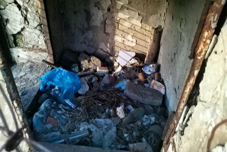 На старой, ржавой решетчатой двери висит замок, проникнуть в помещение непросто. Ключ – у жильцов одной из квартир, это написано на табличке, висящей рядом. Спускаться по лестнице вниз и находиться в укрытии без фонаря невозможно – внутри нет света. Помещение забито деревянными столами, стульями и досками, ведерками и коробками от строительных материалов, трубами, шкафами и старым спортивным инвентарем. На полу — мусор: тряпки, старая одежда, пакеты и бутылки. В одной из комнат стоит полуразрушенный унитаз. Стены исписаны и обшарпаны, а вытяжка, которая выходит на улицу, забита мусором.