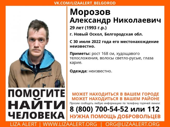 В Белгородской области ищут 29-летнего мужчину, Александра Николаевича Морозова. Его местонахождение неизвестно с 30 июля 2022 года.