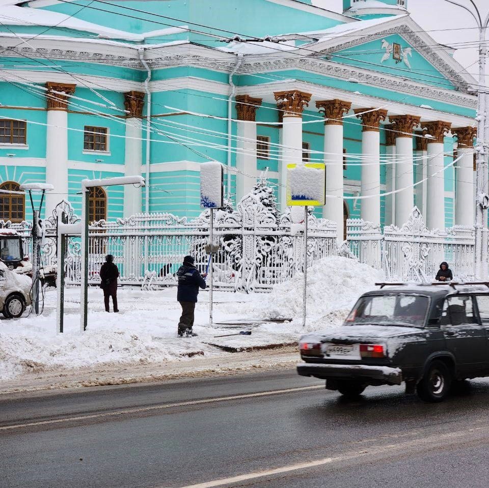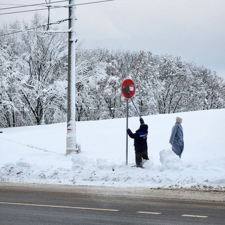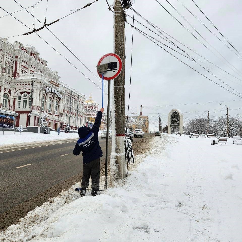 В комитете дорожного хозяйства сообщили, что сотрудники специализированного монтажно-эксплуатационного предприятия Курска очищают от снега дорожные знаки по всему городу.