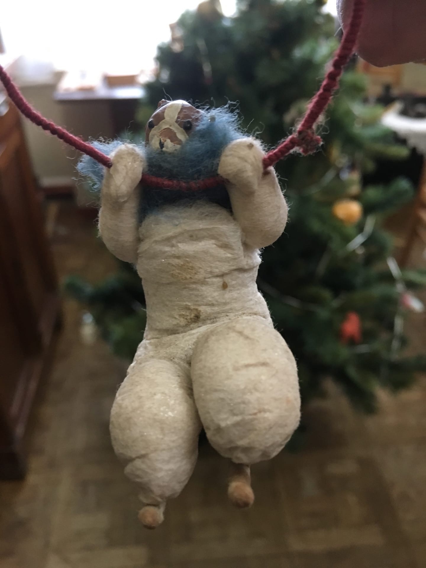 — До войны была популярна новогодняя серия елочных игрушек, посвященная цирку: «Гимнасты», «Слон на шаре». Они появились после выхода на экраны фильма «Цирк», — рассказывает заведующий историко-проектным отделом Алексей Чубаров. — В коллекции музея — ватная игрушка «Собачка на обруче».