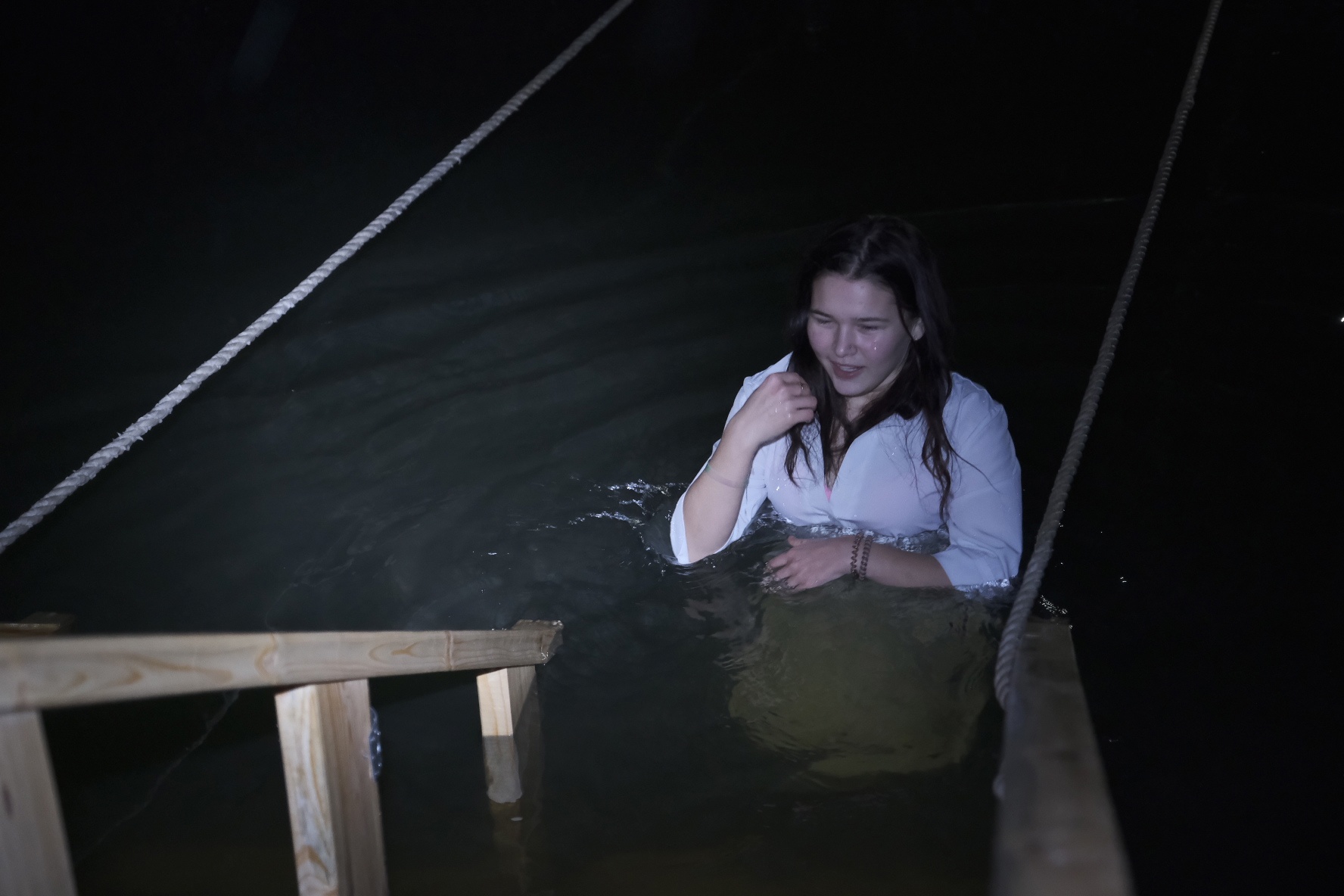 После погружения в воду паломники бегут согреться: на берегу установлены две обогреваемые палатки. Время приближается к полуночи, а у проруби светло, как днём: установлены два световых прожектора.