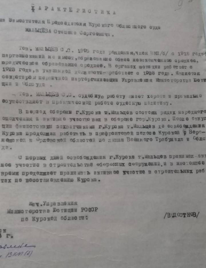 — Степан Сергеевич родился в 1995 году в курской деревне, отец ездил на заработки, мать батрачила у зажиточных крестьян. В 20-летнем возрасте Мальцева забрали в «старую», как он писал, армию, в Первую мировую войну он был рядовым, а когда вернулся в свою деревню, стал председателем «сельсовета и комитета бедноты», — рассказывает руководитель Объединенной пресс-службы судебной системы Курской области Анна Полянская. – Затем он участвовал в Гражданской войне — воевал на южном фронте. Судьей Степан Сергеевич начал работать с 1923 года, а с 1938 года стал заместителем председателя Курского областного суда. Ценился опыт. Тогда Мальцев имел незаконченное среднее образование и только перед самой Великой Отечественной войной он окончил высшие юридические курсы в Москве. Сохранилась и характеристика Степана Сергеевича, в которой говорится, что в период обороны Курска Мальцев состоял в рядах народного ополчения.