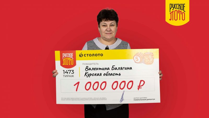 Жительница Курской области Валентина Балягина выиграла 1 миллион рублей в 1473-м тираже лотереи «Русское лото». Выигрыш ей вручили в Москве в центре «Столото».