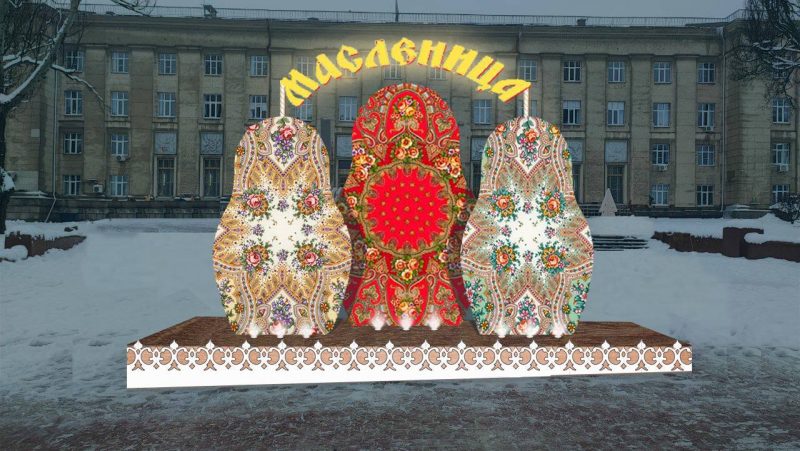 Ёлки переместят и «переоденут» из новогодних украшений в красные, жёлтые и оранжевые ленты. Макушки хвойных деревьев украсят фигурками солнца. На площадке также установят фотозону из трёх матрёшек со световыми буквами «Масленица».