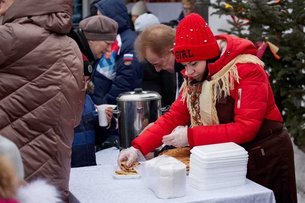 На площадях работали торговые павильоны с горячими напитками и главным масленичным блюдом