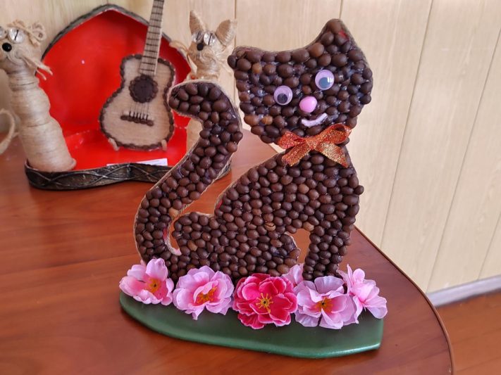 – За основу игрушки берётся обязательно натуральная ткань, – делится нюансами мастерица. – Я предпочитаю бязь, она послушнее, хорошо впитывает и шьётся, но можно и ситец. Вырезаем фигуры. В качестве наполнителя используем синтепон – он быстрее сохнет. Но можно и вату. Затем берём обычный растворимый кофе, разводим в холодной воде и лёгким движением руки наносим кисточкой кофе. Затем сушим игрушку. День – и кофейные коты готовы. А чтобы аромат был ещё более выраженным, внутрь игрушки надо положить несколько кофейных зёрнышек.