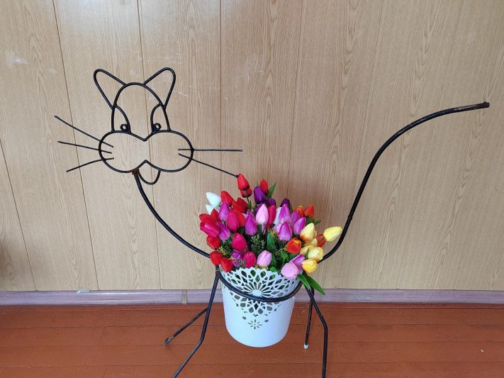 – У нас в доме много цветов, – рассказывает Марина Удовикова. – Очень их люблю, особенно орхидеи. Я попросила мужа сделать ещё одно кашпо-кошечку в пару к подаренному им коту. Она получилась с характером, с закрученными усиками.