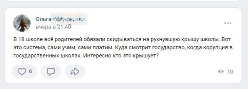 Накануне в социальных сетях появилась информация о том, что родителям учеников школы №18 города Курска предложили собрать деньги, якобы на ремонт рухнувшей кровли. За комментарием корреспонденты «Курской правды» обратились к руководителю учебного заведения Светлане Медвецкой.