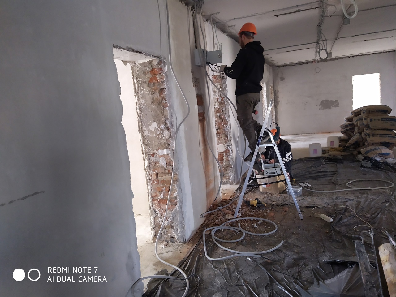 По словам министра образования и науки региона Наталии Бастриковой, сегодня ведутся работы по оштукатуриванию стен здания, ремонту фасада здания, идет монтаж электросетей и прокладка водопровода.
