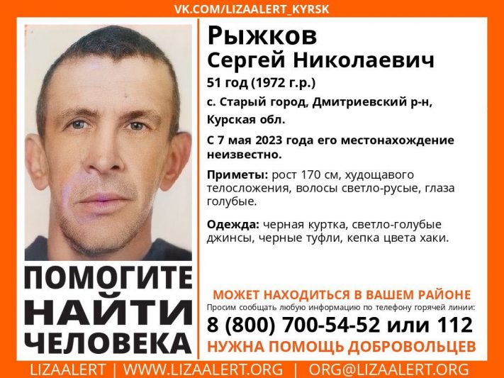 Поисковый отряд «Лиза Алерт» объявил о том, что в Курской области пропал 51-летний Сергей Рыжков. Местонахождение мужчины неизвестно с 7 мая.