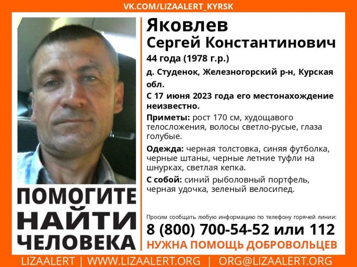 Поисковый отряд «Лиза Алерт» объявил поиски 44-летнего Сергея Яковлева. Мужчина пропал 17 июня этого года, с тех пор его местонахождение неизвестно.
