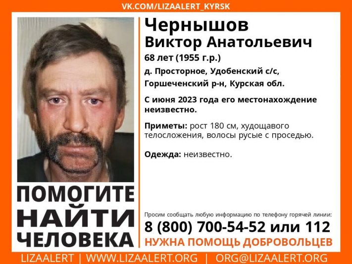 Волонтёры отряда «Лиза Алерт» объявили о поисках 68-летнего Виктора Анатольевича Чернышова. Пенсионер пропал в июне, с тех пор его местонахождение неизвестно.
