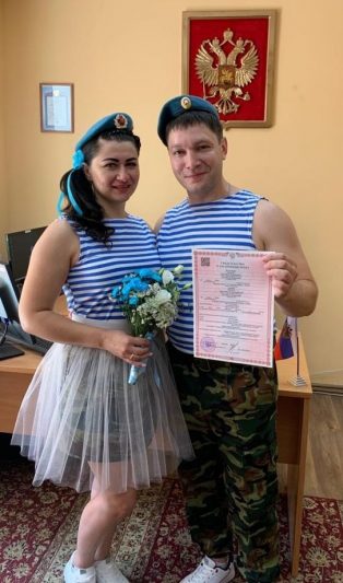 На церемонию регистрации Дмитрий надел элементы формы крылатой пехоты – тельняшку и голубой берет. В свой свадебный наряд их добавила и Екатерина.