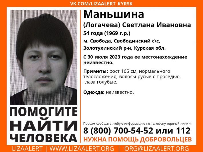 Волонтёры отряда «Лиза Алерт» объявили о поисках 54-летней Маньшиной (Логачевой) Светланы. Жительница местечка Свобода Золотухинского района пропала 30 июля, с тех пор её местонахождение неизвестно.