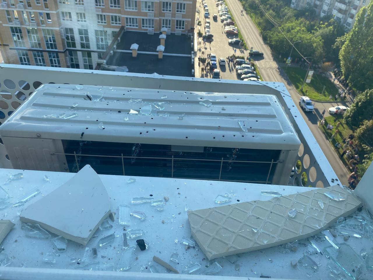 Пострадавших нет. В нескольких квартирах выбиты окна, повреждены кондиционеры, посечен фасад здания. Также пострадали порядка 15 машин.