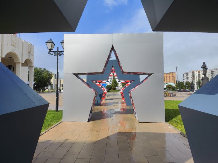 В преддверии юбилейной даты на улицах Курска появились тематические фотозоны, праздничные инсталляции и композиции из флагов. Самым ярким убранством может похвастаться Театральная площадь. Здесь помимо фотозоны у фонтана появились большие звёзды и объёмная фигура с цифрой 80. Над улицей Ленина разместили поздравительные растяжки, которые будут светиться вечером.