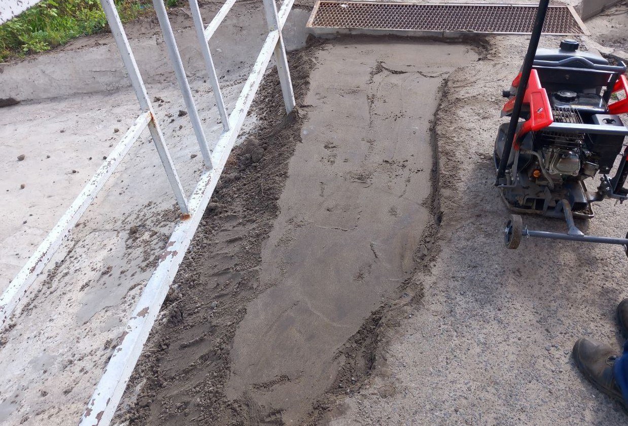 Следующим этапом выполнили отсыпку фрезератом и утрамбовали покрытие виброплитой на площади 2 квадратных метра.