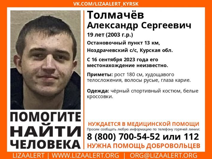 В Курской области ищут 19-летнего Александра Толмачёва. Молодой человек пропал 16 сентября, с тех пор его местонахождение неизвестно.