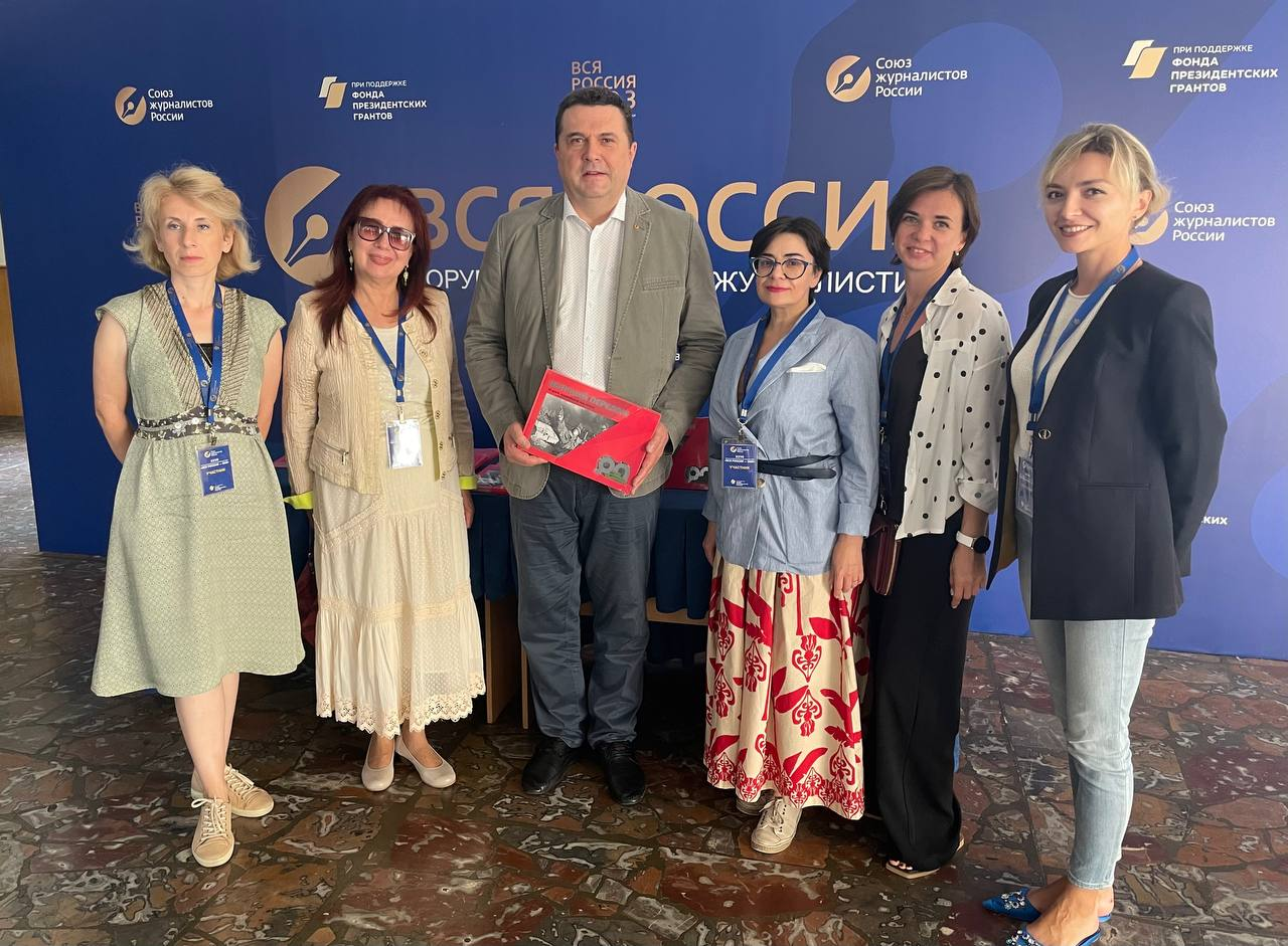 Председатель регионального отделения Союза журналистов России Ольга Болдырева передала главе СЖР Владимиру Соловьеву книгу-фотоальбом «Великий перелом. 50 дней, изменившие ход войны», созданную редакцией газеты «Курская правда» к 80-летию Огненной Дуги.