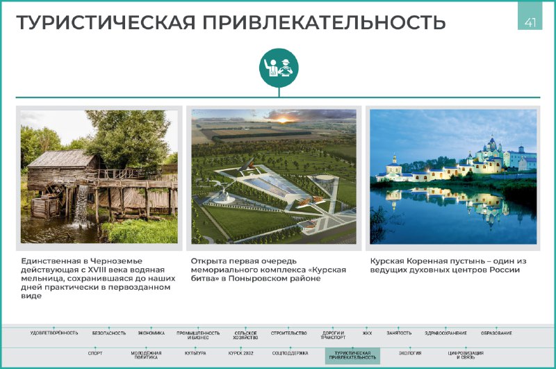 Главными точками притяжения в регионе стали водяная мельница в Красниково, Коренная пустынь и мемориал «Курская битва» в Поныровском районе.