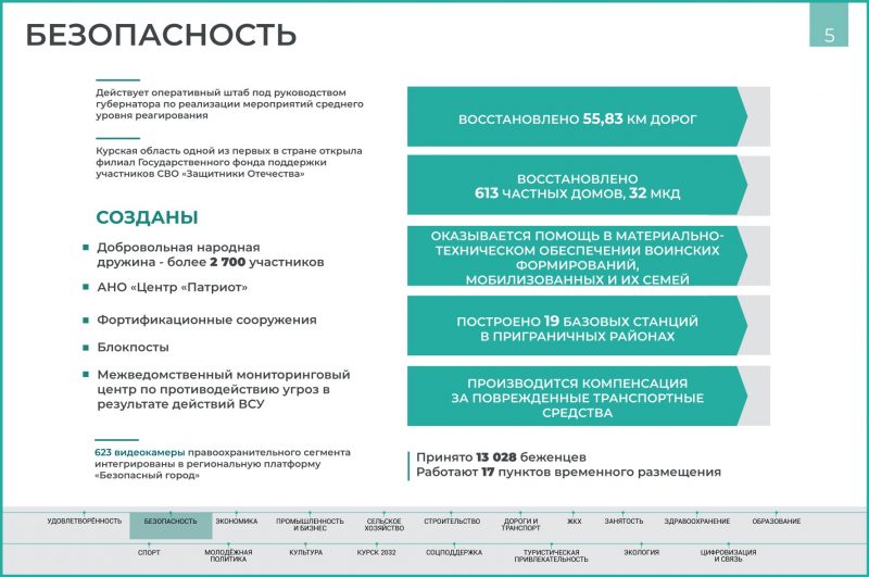 Всего в регионе восстановили уже 55,83 километра дорог, 613 частных и 32 многоквартирных дома, повреждённых во время обстрелов. Кроме того, с начала СВО Курская область приняла больше 13 тысяч беженцев и организовала 17 пунктов временного размещения.