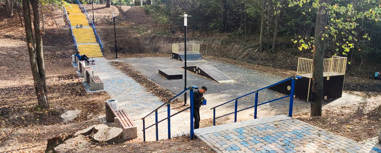 На втором этапе работ участок расчистили от поросли, затем смонтировали пешеходную лестницу с ограждением и собрали площадку для скейтбординга.