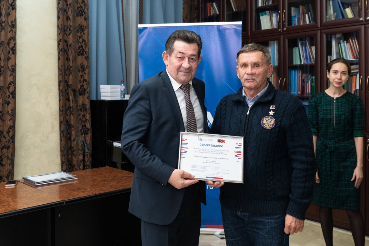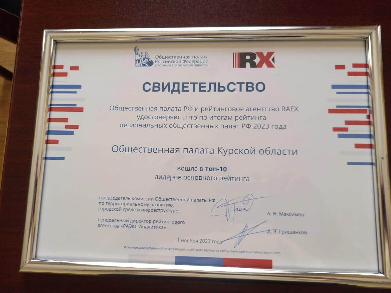 В среду, 1 ноября, на заседании Совета Общественных палат России первый заместитель секретаря Общественной палаты Российской Федерации, Герой России Вячеслав Алексеевич Бочаров вручил председателю Общественной палаты Курской области Лазареву Алексею Ивановичу свидетельство, что по итогам рейтинга региональных общественных палат РФ 2023 года Общественная палата Курской области вошла в топ-10 лидеров основного рейтинга.