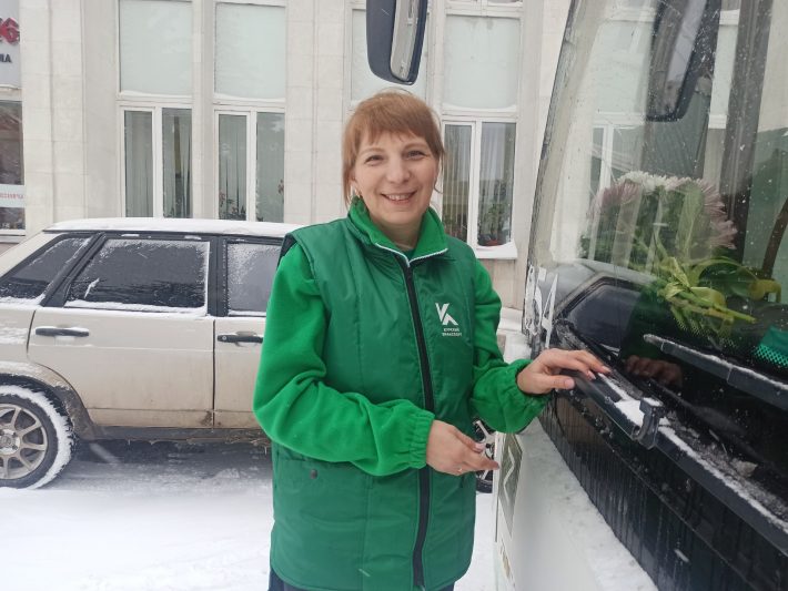 Среди пассажиров — ветераны службы транспорта. За рулём — водитель Елена Кравченко. В праздник настроение у водителя — рабочее.