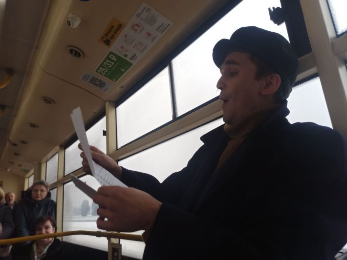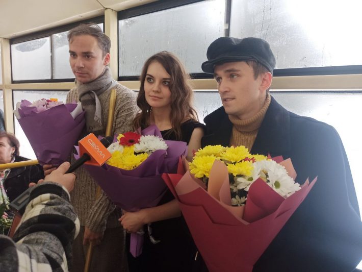 — Это новая форма подачи драматического произведения, — говорит художественный руководитель проекта Ольга Люстик. – Артисты выходят из театра и показывают спектакль на улице. В Курске премьера первого спектакля-променада стартовала 20 ноября, в день, когда свой профессиональный праздник отмечают работники транспорта, именно потому салон троллейбуса превратился сегодня в сцену.