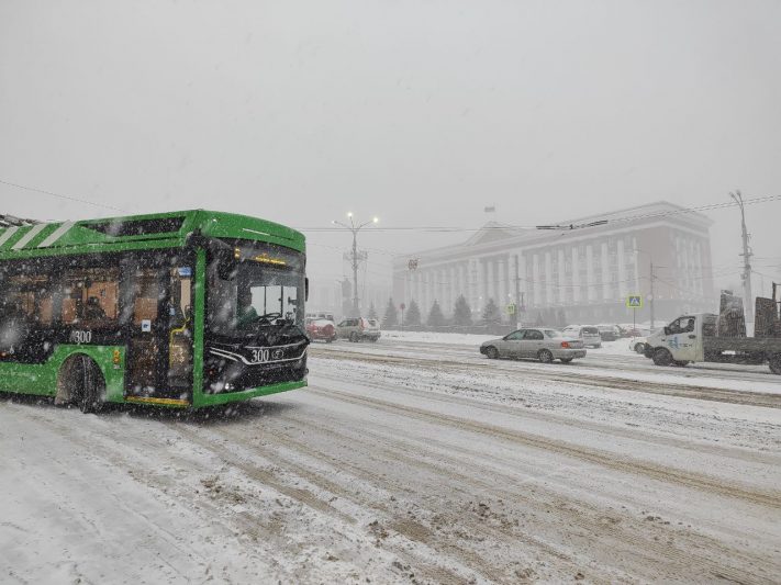 Из-за сильной метели, которая обрушилась на Курск, автобусы, троллейбусы и трамваи могут отставать от графика.