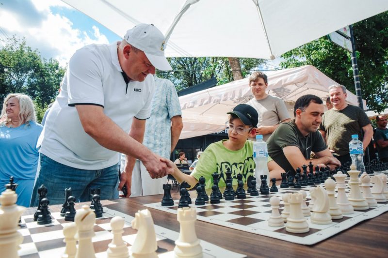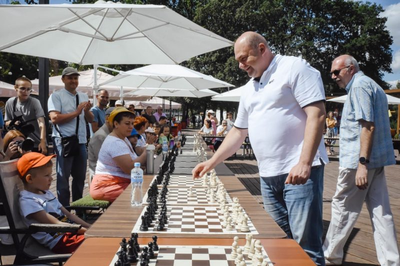 Сегодня в парке «Боева дача» Алексей Смирнов поприветствовал участников сеанса одновременной игры в шахматы с международным мастером Олегом Кулиĸовым. Мероприятие проходит в Курске уже не первый год.