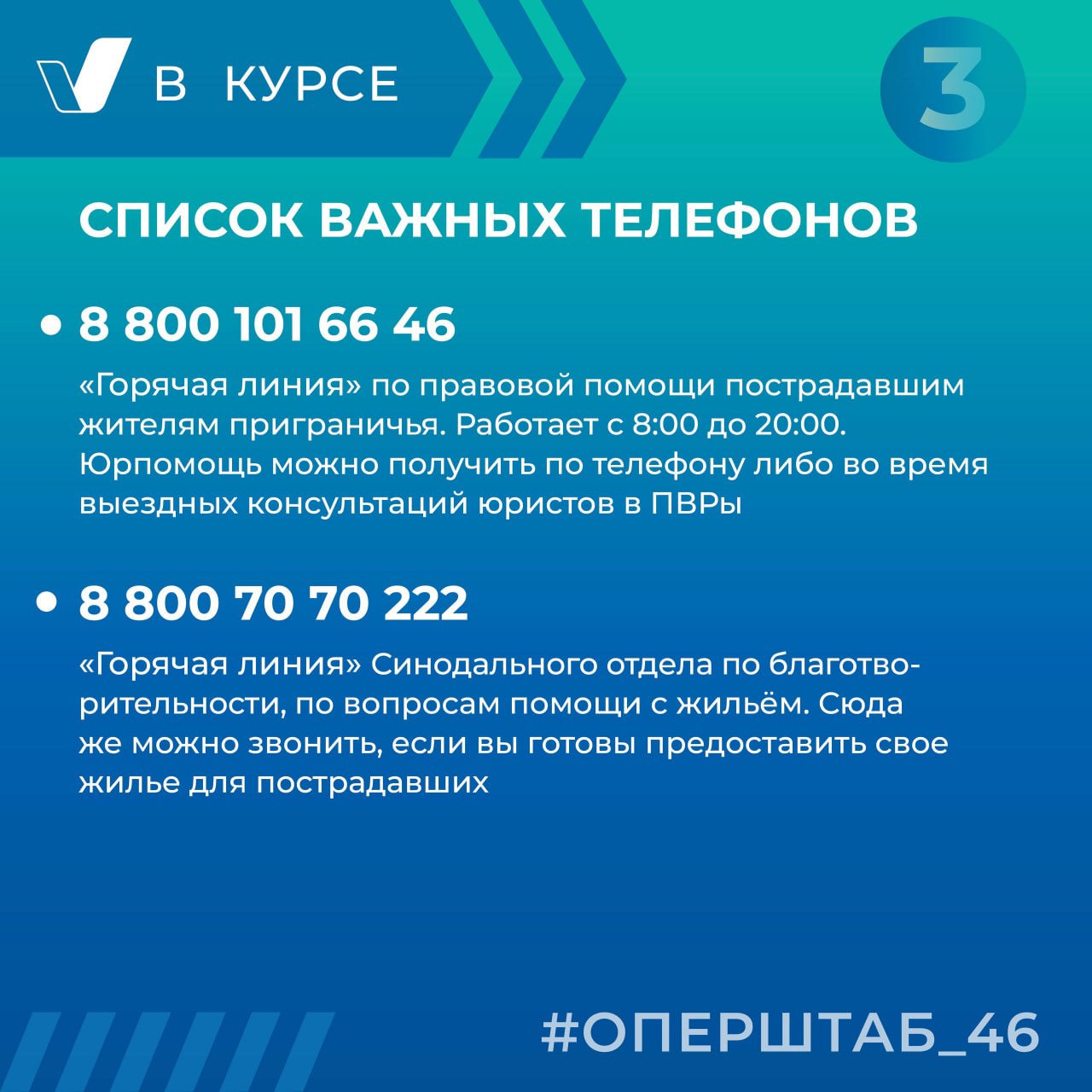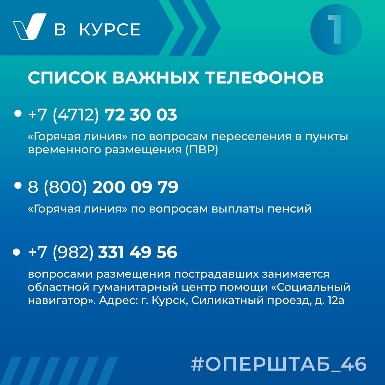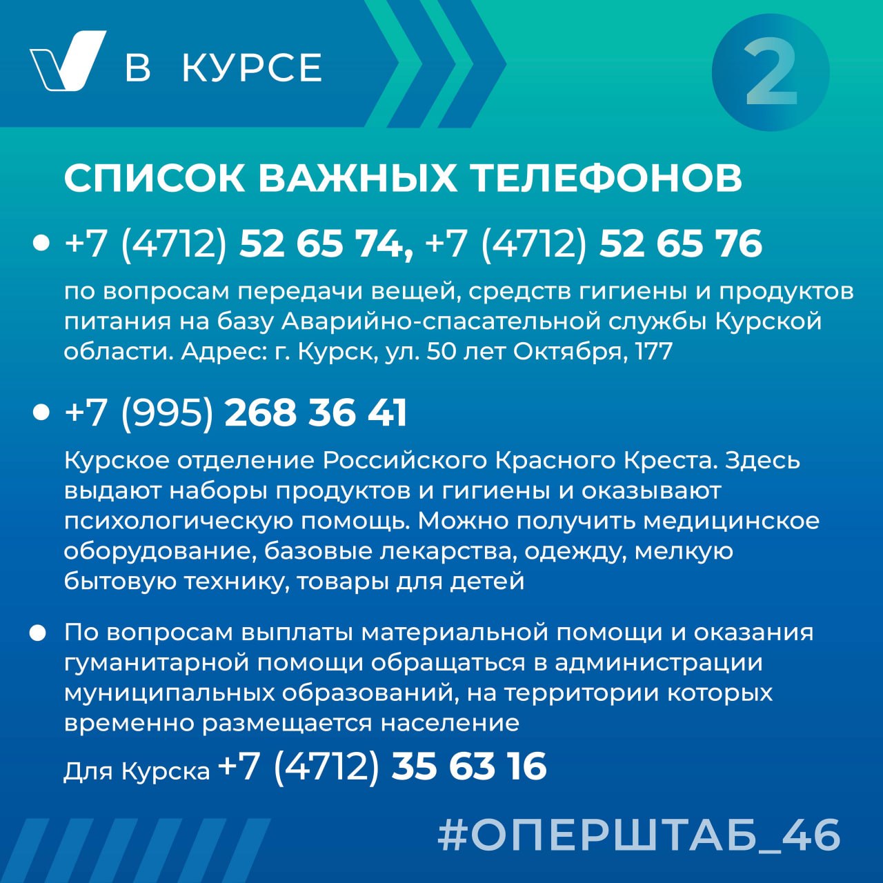 Ситуацию в Курской области признали ЧС федерального масштаба. Обстановка продолжает оставаться сложной, но контролируемой. В Курске развернули гуманитарный склад для оказания помощи временно покинувшим свои дома жителям приграничья. Здесь будут аккумулировать помощь, поступающую из регионов. Временно исполняющий обязанности губернатора Алексей Смирнов у себя в телеграм-канале опубликовал список телефонных номеров, где люди смогут получить помощь по самым разным вопросам.