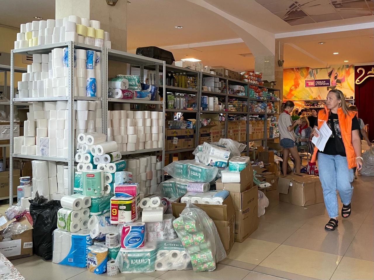 Волонтеры работают по самым разным направлениям: разгружают гуманитарные грузы, собирают заказы для жителей приграничья и выдают необходимое.