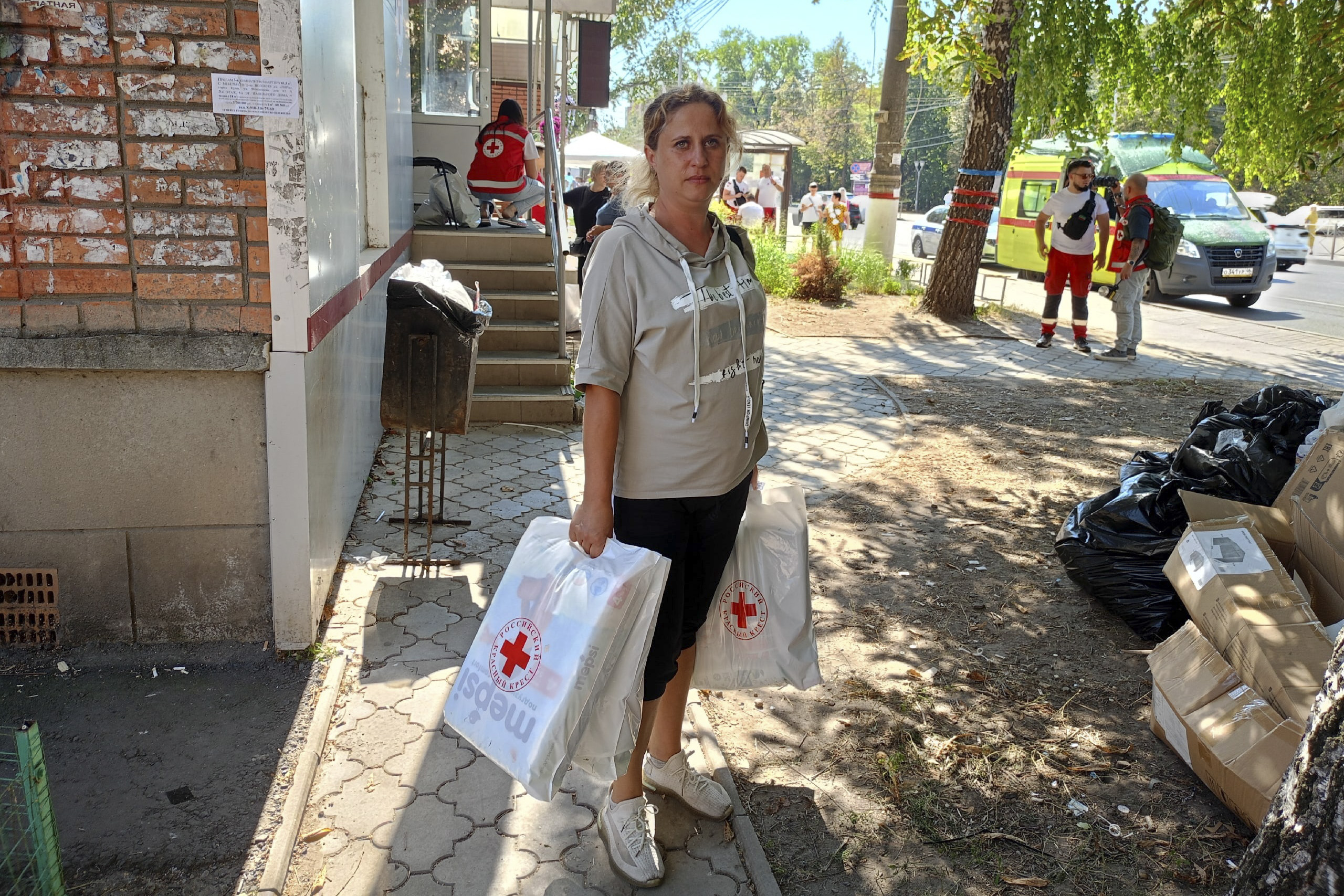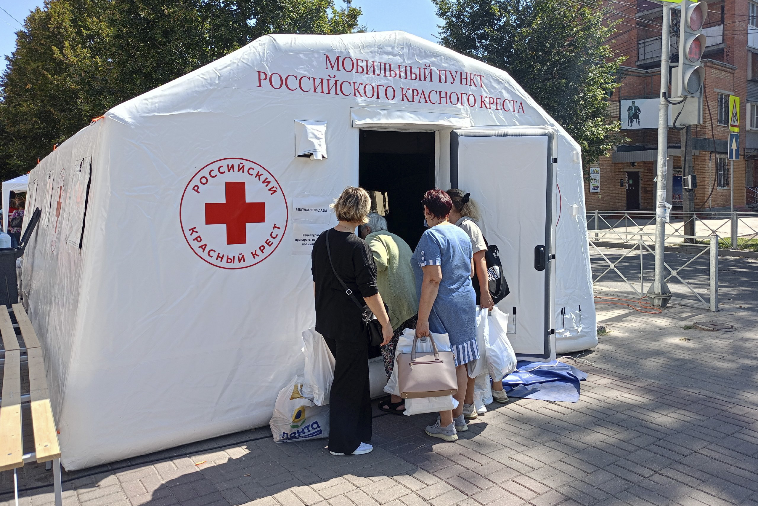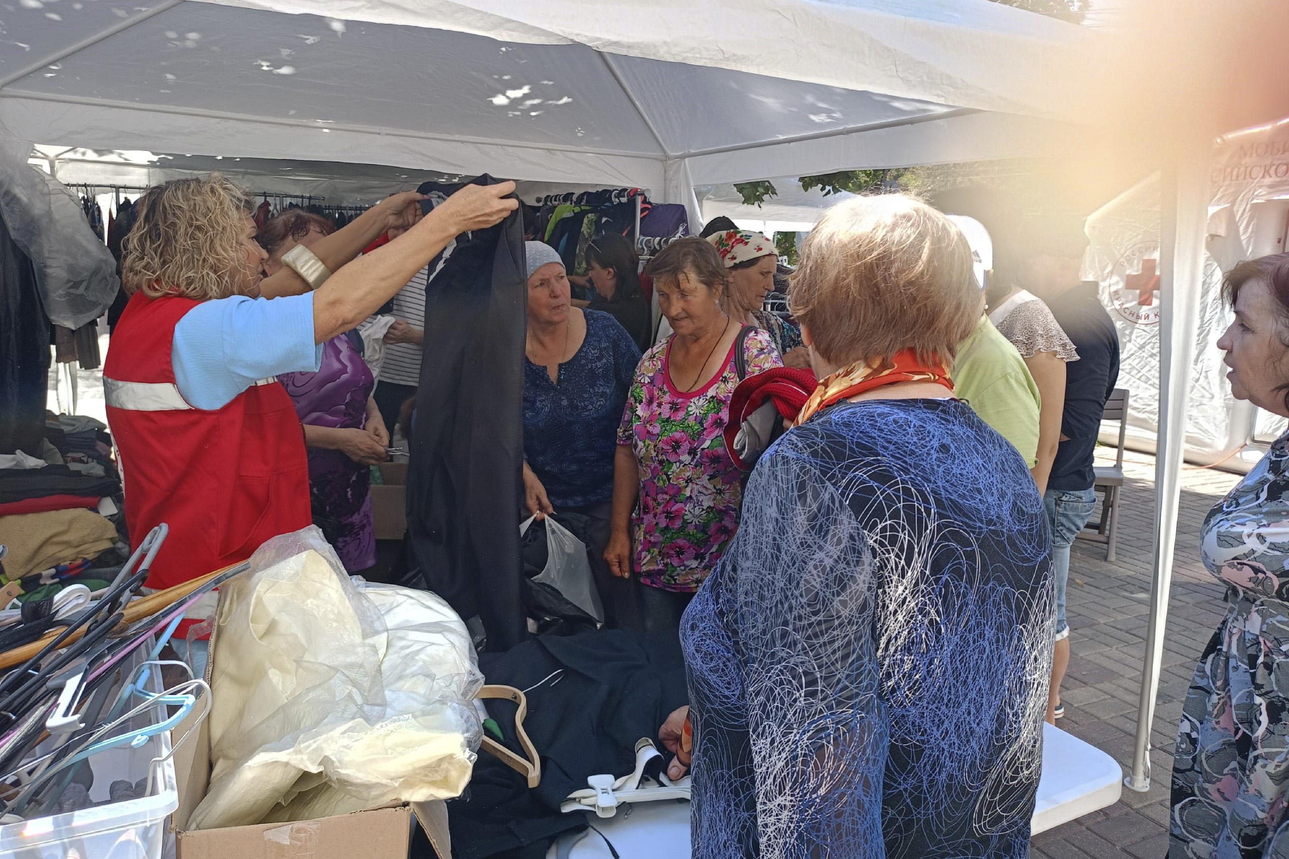 В Курске по обеим сторонам остановки «улица Гоголя» развернулся городок «Красного креста»: палатки с одеждой, лекарствами. На одном пункте склада выдают гигиенические принадлежности, на другом – продуктовые наборы.