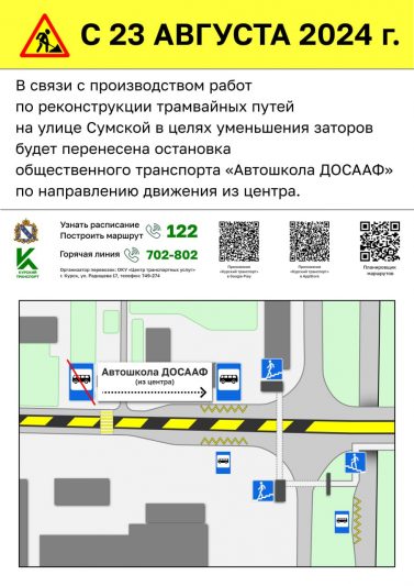 В Курске продолжают реконструкцию трамвайных путей в микрорайоне КЗТЗ. Для того, чтобы уменьшить автомобильные заторы на улице Сумской, в региональном минтрансе приняли решение временно перенести автобусную остановку «Автошкола ДОСААФ» по направлению движения из центра города.