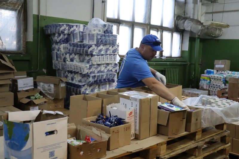 Волонтёры центра формируют гуманитарные наборы для передачи вынужденным переселенцам.