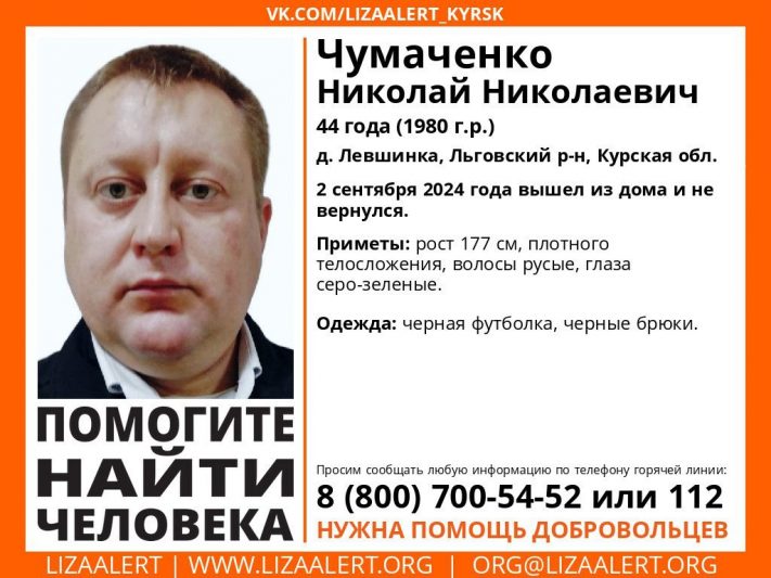 Поисковый отряд «Лиза Алерт» объявил о розыске Николая Чумаченко. 44-летний мужчина вышел из дома 2 сентября и до сих пор не вернулся.