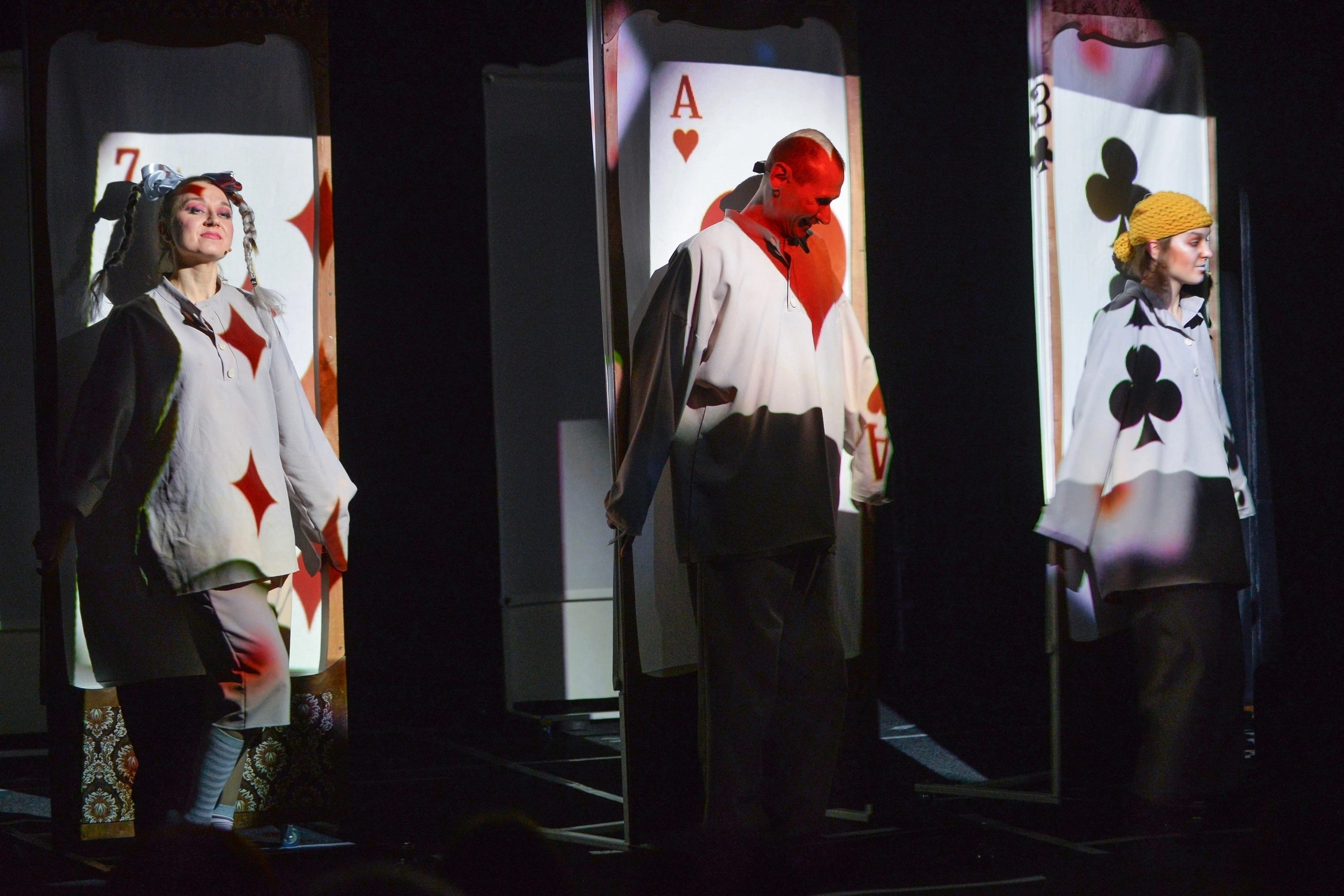 Важнейшие элементы формирования атмосферы спектакля – пластические этюды, музыка и особенно световое решение с элементами видеопроекции. Актёры работают живым планом, в качестве визуальной поддержки повествования используя образы теневого театра и планшетных кукол. Участники спектакля, в том числе Германн, – пациенты психиатрической лечебницы. Один из методов восстановления психически больных – театр-терапия.