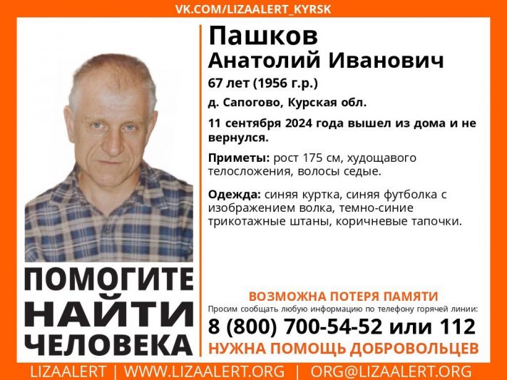 Волонтёры отряда «Лиза Алерт» объявили о поисках 67-летнего Анатолия Пашкова. 11 сентября пенсионер вышел из дома, но домой так и не вернулся.