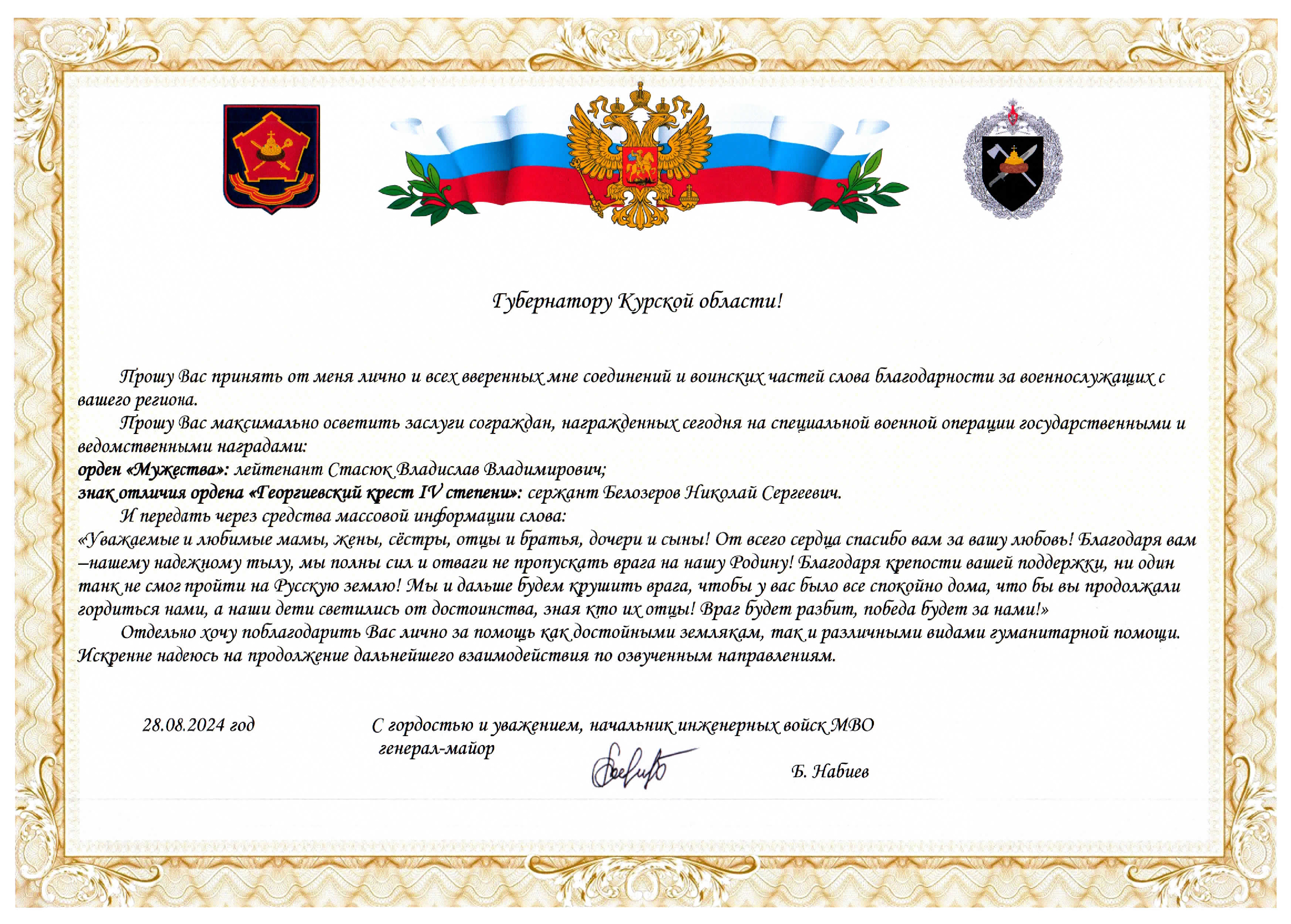 Двоих жителей Курской области, которые принимают участие в специальной военной операции, наградили за заслуги в ходе боевых действий. Об этом в письме губернатору Алексею Смирнову сообщил начальник инженерных войск Московского военного округа генерал-майор Бахтияр Набиев.