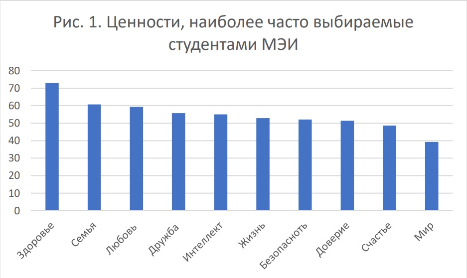 На основе полученных данных мы выделили 10 наиболее часто выбираемых студентами МЭИ ценностей. 72,9 % опрошенных в МЭИ отметили здоровье как наиболее значимую для них ценность. 60,7 % респондентов выделили семью, а 59,3 % – любовь. Кроме того, по итогам опроса в МЭИ в топ-10 вошли такие ценности, как дружба, интеллект, жизнь, безопасность, доверие, счастье и мир.
