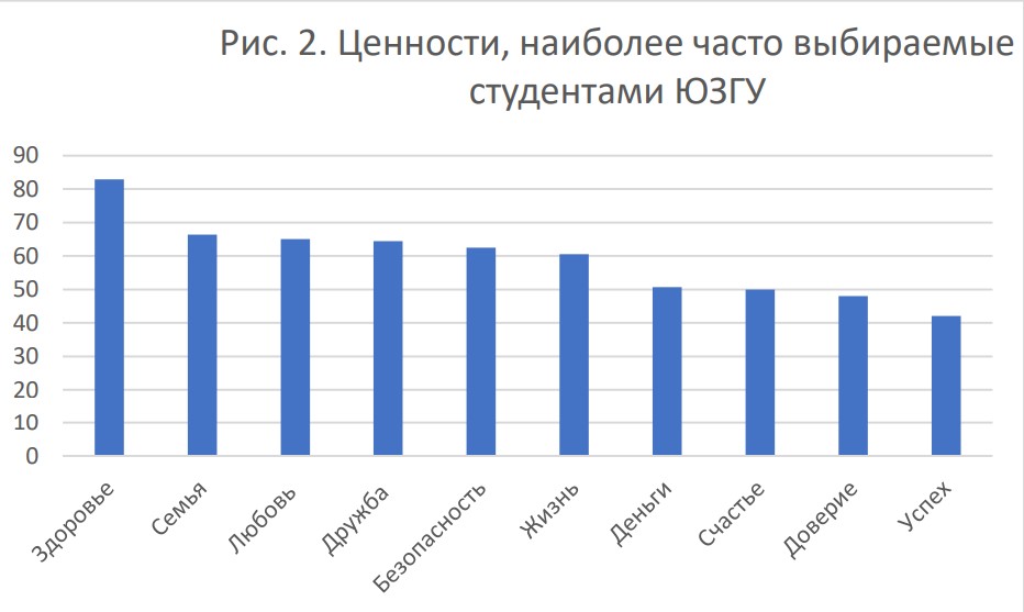 Мы также проанализировали анкеты курских студентов и составили список наиболее важных ценностей. Отметим, что в целом выявлено много общего для студентов из Москвы и Курска. Первые четыре места в списке наиболее часто выбираемых студентами ЮЗГУ и МЭИ ценностей занимают: здоровье (82,9 %), семья (66,4 %), любовь (65,1 %) и дружба (64,5 %). В топ-10 ценностей курян и москвичей вошли безопасность, жизнь, счастье и доверие. Для студентов МЭИ деньги и успех не столь значимы: вместо них в топ-10 представлены интеллект и мир.
